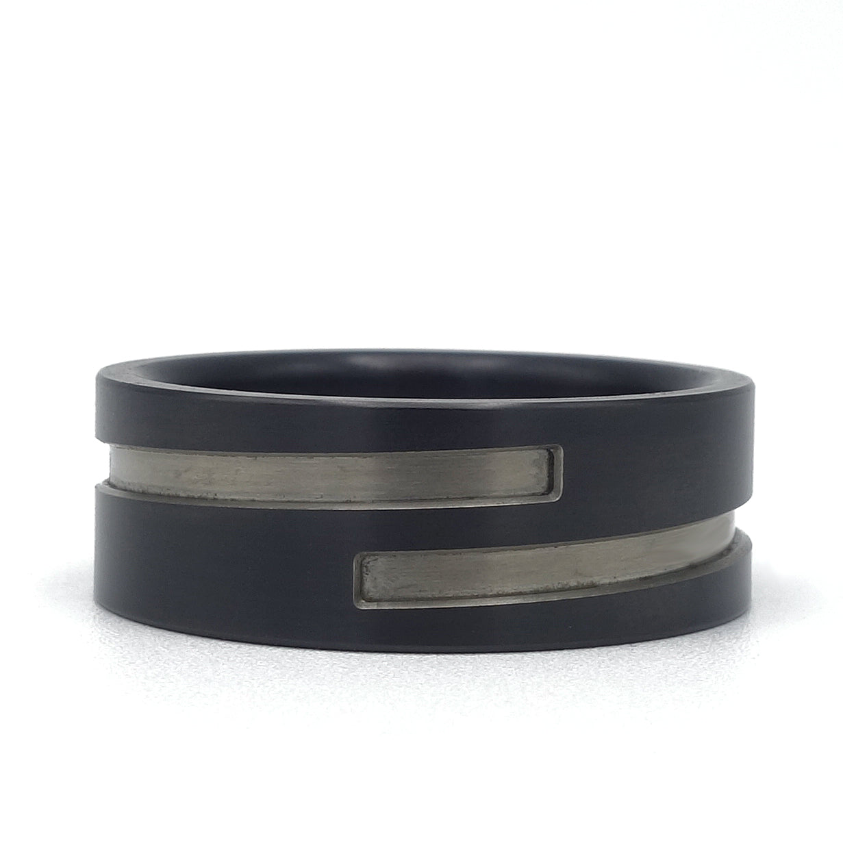 Twee ringen, één verhaal – opnieuw verteld. In deze variant zijn de kleuren omgedraaid: de brede ring Adam is uitgevoerd in zwart zirkonium met een contrasterende matte grijze inleg, terwijl Eva juist grijs is met een subtiel zwart accent aan de binnenzijde. Ook hier lijkt de ring Eva als een deel uit Adam te zijn genomen – een eigentijdse vertaling van verbondenheid. Het resultaat: twee krachtige vormen die elkaar aanvullen in contrast en harmonie.
