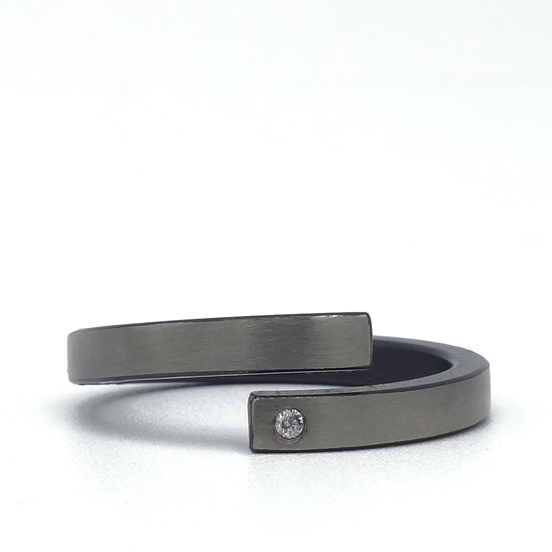 Beide ringen zijn gemaakt van zirkonium. Door het materiaal deels te verhitten ontstaat het diepe zwart, terwijl het ongekleurde deel juist een zachte, industriële grijstint behoudt. De kleine diamant in Eva maakt het ontwerp compleet.