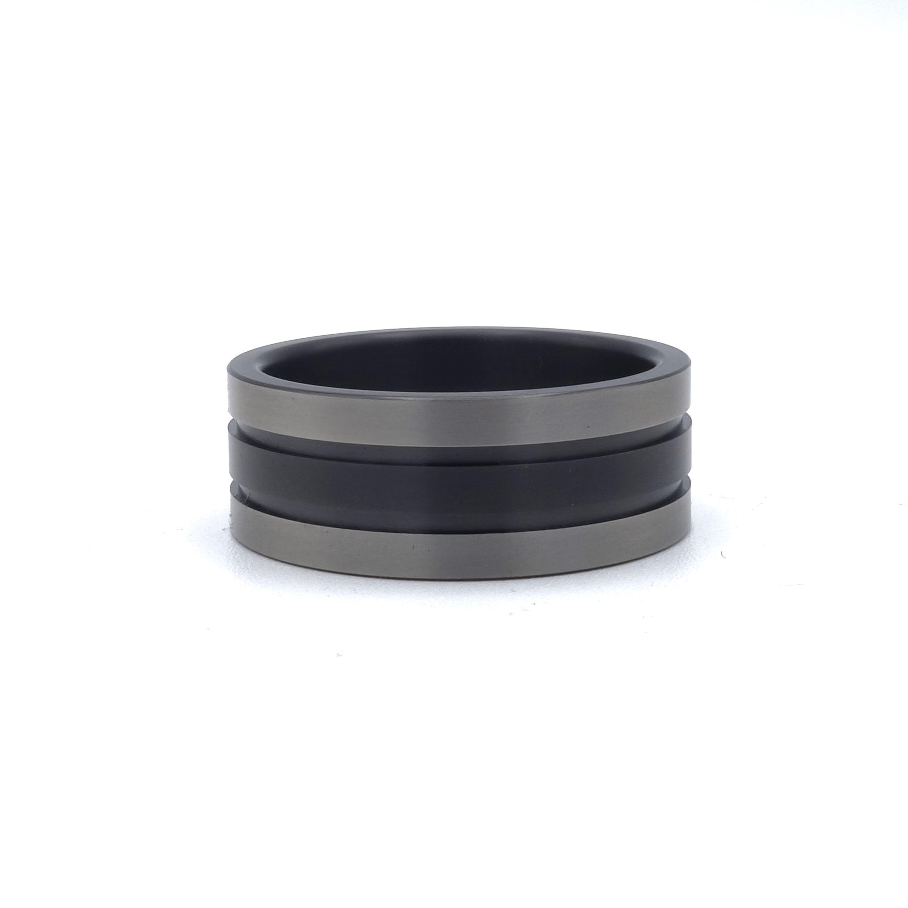 De Azura is een moderne ringenset van zirkonium met een verfijnd lijnenspel. Beide ringen zijn opgebouwd uit matgrijs zirkonium met diepzwarte lijnen die strak in het ontwerp zijn verzonken. De damesring (5 mm breed) is voorzien van een briljant geslepen blauwe diamant van 0.05 ct, geplaatst in een semi-spanzetting: de steen lijkt te zweven tussen de ringhelften, maar wordt subtiel ondersteund aan de achterkant voor extra stevigheid. De herenring (8 mm breed) volgt hetzelfde strakke ontwerp, zonder diamant. Andere kleuren diamant, zoals wit, champagne of zwart, zijn op aanvraag mogelijk.