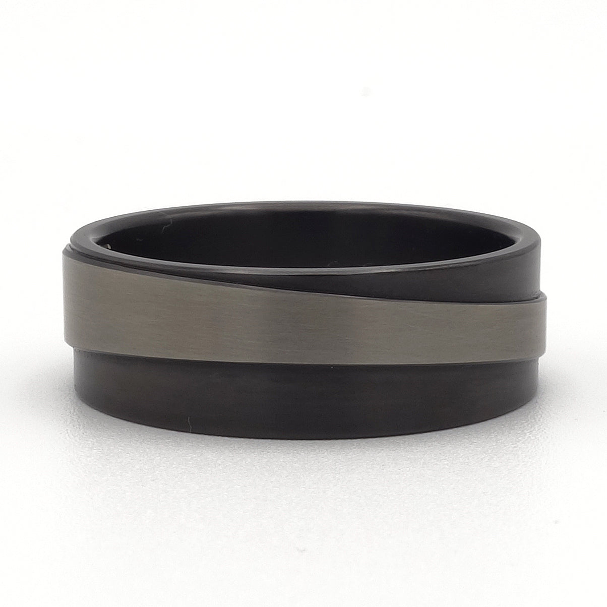 De Brontes trouwringen zijn een krachtig voorbeeld van modern design in puur zirkonium. Beide ringen zijn uitgevoerd in twee tinten zirkonium: een matgrijs bovenvlak gecombineerd met een diep matzwart schuine onderzijde. Het kleurverschil ontstaat door het contrast in bewerking – zonder coatings of inleg – wat zorgt voor een robuust en technisch effect.