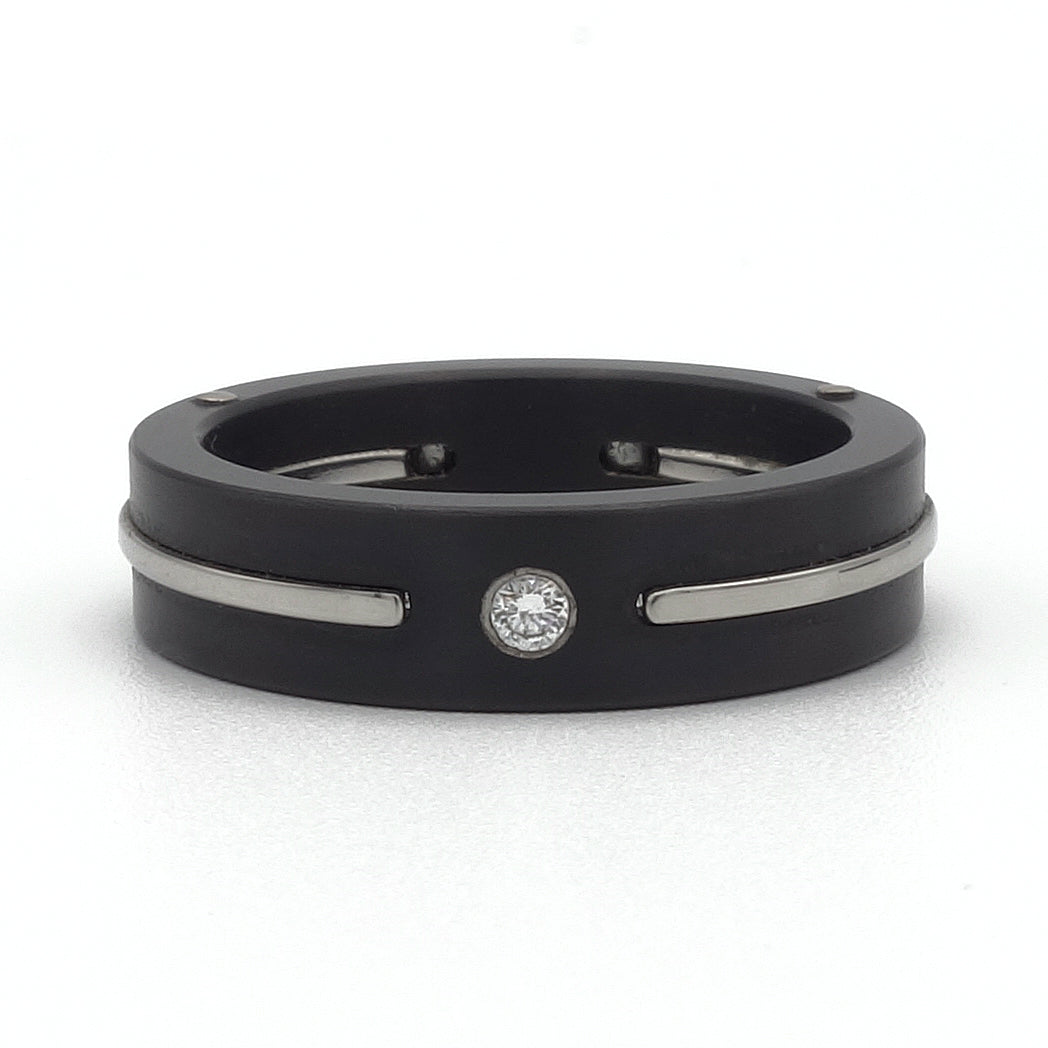 De damesring (C1) is 5 mm breed en voorzien van een briljant geslepen diamant van 0.05 ct (VS1), elegant geplaatst in het midden van de stalen lijn. De herenring (C3) is 7 mm breed en toont dezelfde materialen in een robuust, maar ingetogen ontwerp zonder steen.