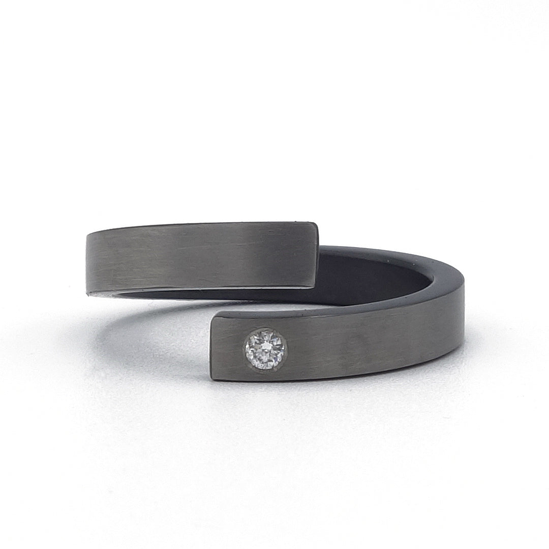 Strak, modern en subtiel opvallend – de Eva Grey is een open ring gemaakt van zirkonium met een matgrijze bovenkant, gecombineerd met zwarte zijkanten en binnenzijde. Deze contrasterende afwerking geeft de ring een unieke uitstraling. In de scheen is een briljant geslepen diamant van 0,03 ct verzonken geplaatst – een verfijnd detail dat elegantie toevoegt aan het minimalistische ontwerp.