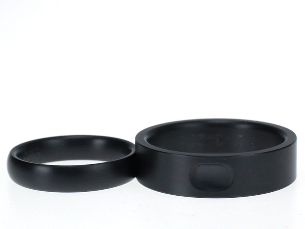 De Fit-in set in zwart zirkonium speelt met contrast in vorm én kleur. Deze opvallende, moderne ringen hebben elk een eigen karakter, maar horen onmiskenbaar bij elkaar. De ene ring is strak en vlak, met een uitsparing die precies de ronding van de andere volgt. De ander is licht bol en bevat de strakke vorm van zijn tegenhanger.