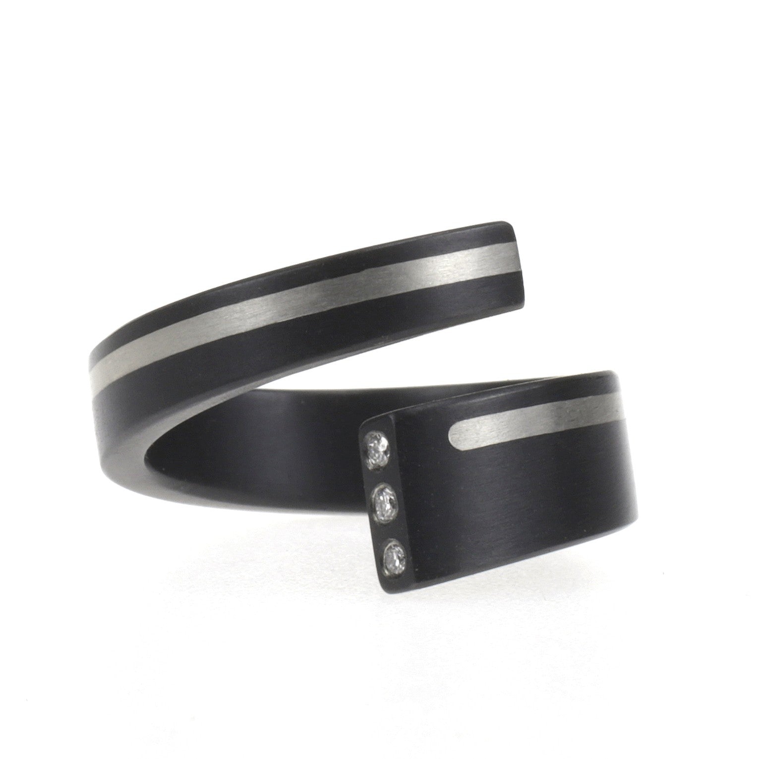 De ring is gemaakt van zwartgeoxideerd zirkonium, met een strak ingelegd platina accent dat de vorm elegant volgt. Aan het uiteinde zijn drie briljant geslepen diamanten van elk 0,01 ct subtiel geplaatst in een schuin lopend vlak. Dit geeft de ring een opvallend en luxe detail, zonder zijn moderne karakter te verliezen.
