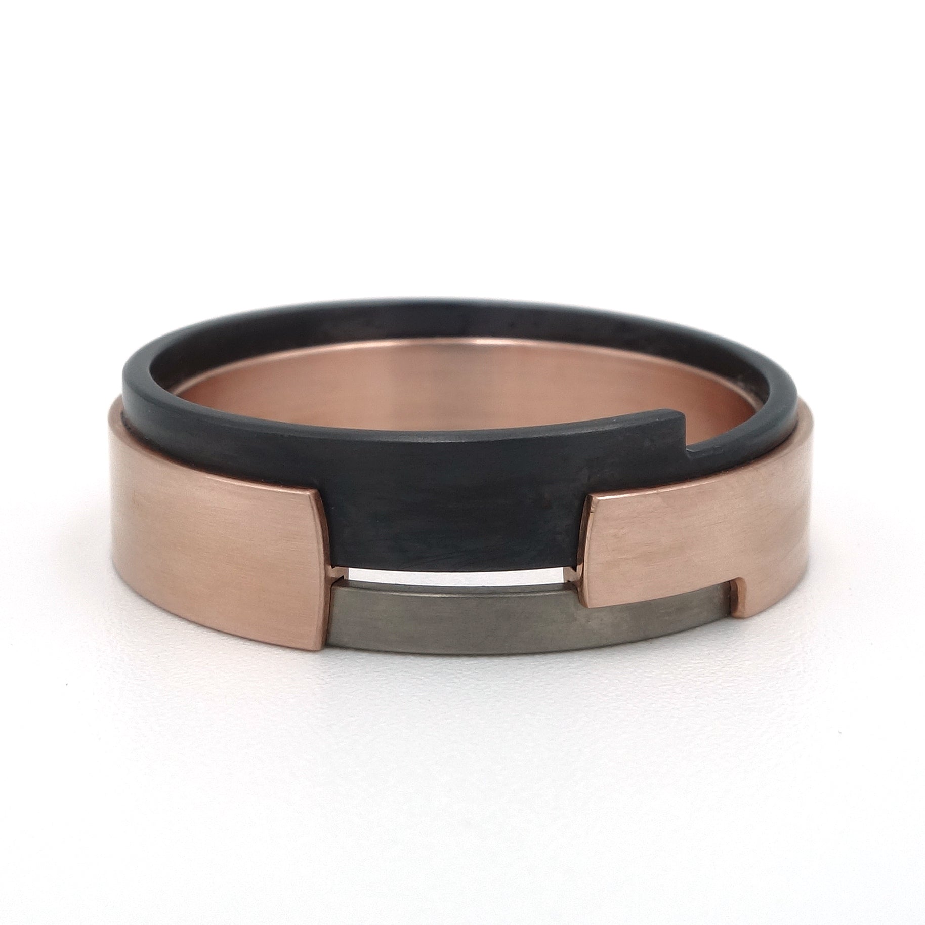 Zoals bij al onze ringen kan ook deze combinatie volledig aangepast worden naar wens – andere kleuren, metalen of een aangepaste breedte? Wij denken graag met jullie mee.