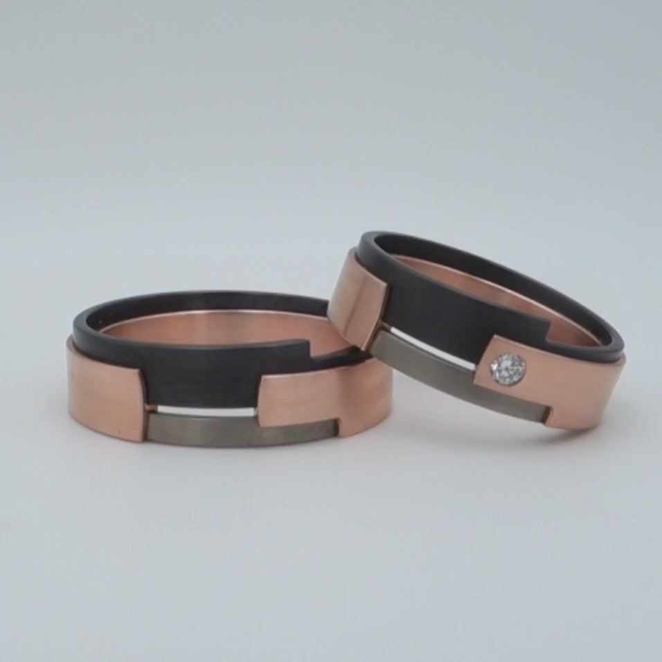 De damesring is afgewerkt met een briljant geslepen diamant van 0.05 ct (kwaliteit VS1), die subtiel maar schitterend opvalt tegen het warme roodgoud. De geometrische schakering maakt deze set spannend en uniek.