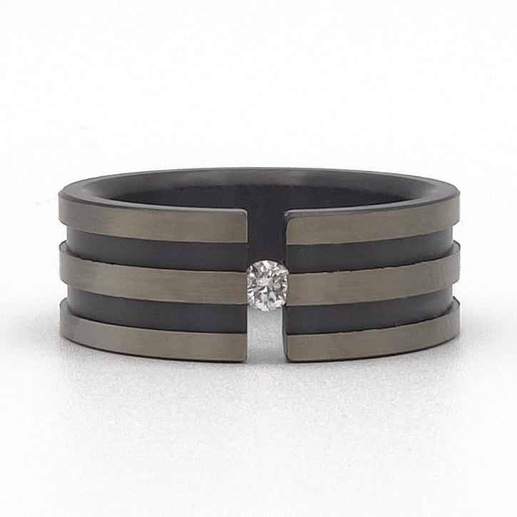 De smallere ring in deze set is voorzien van een briljant geslepen diamant van 0.08ct. De steen is geplaatst in een optische spanzetting, waarbij het lijkt alsof de diamant zweeft tussen de zijkanten van de ring. Voor extra stevigheid is onder de steen een subtiel bruggetje verwerkt – zo blijft het design strak én duurzaam.