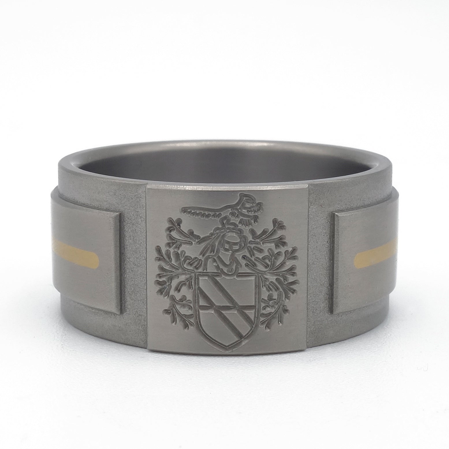 Wil je jouw familiewapen op een eigentijdse manier laten verwerken in een ring? Deze moderne herenring in titanium combineert strak ontwerp met persoonlijk erfgoed. In het midden is het familiewapen diep gegraveerd, omlijst door een strakke vormgeving en aan weerszijden voorzien van een subtiele inleg van 18 karaat geelgoud.