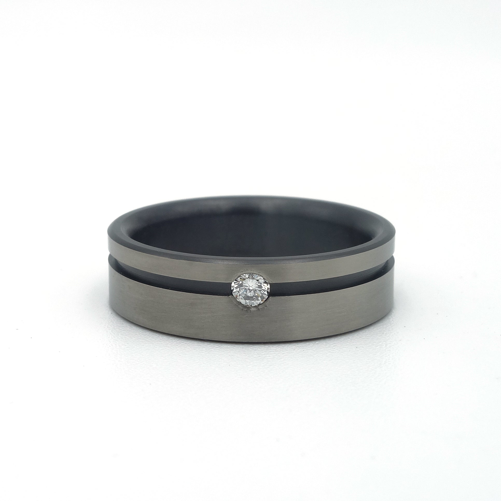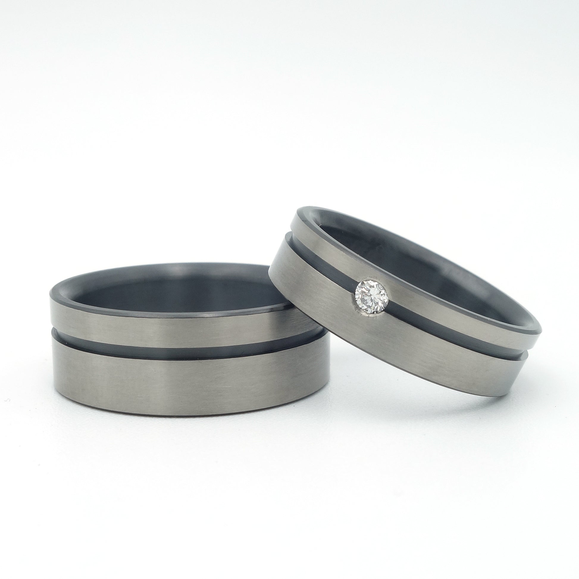 De Streep-ringen vormen samen een krachtig en minimalistisch duo. Het ontwerp draait om contrast van diepzwart en grijs zirkonium gescheiden door een strakke lijn die rust en balans uitstraalt.