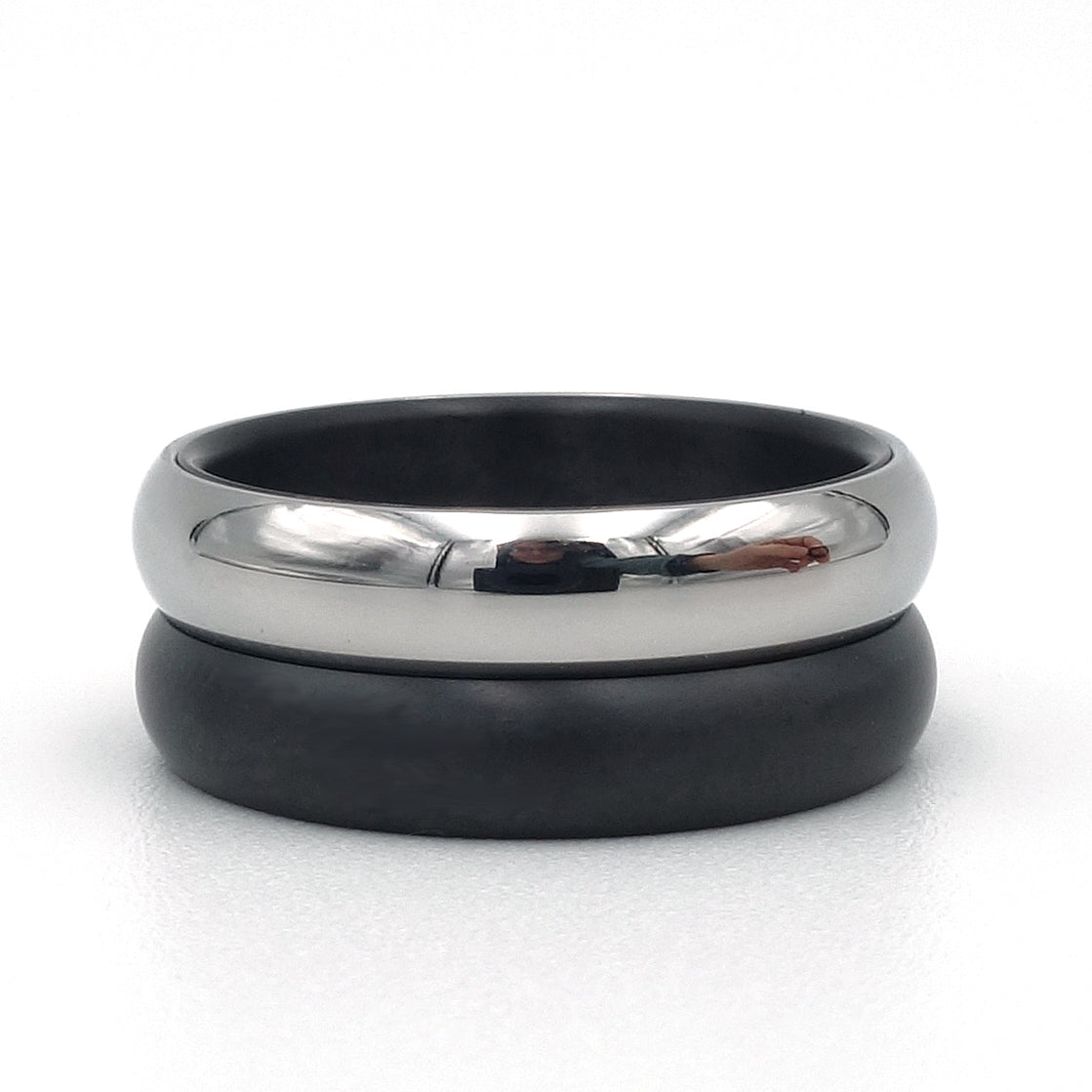 De glanzende, bolle buitenlaag van edelstaal vangt het licht vanuit elke hoek, terwijl het donkere zirkonium de ring een stoer en krachtig karakter geeft. Samen vormen deze materialen een uitgesproken en toch comfortabele ring die dagelijks gedragen kan worden.