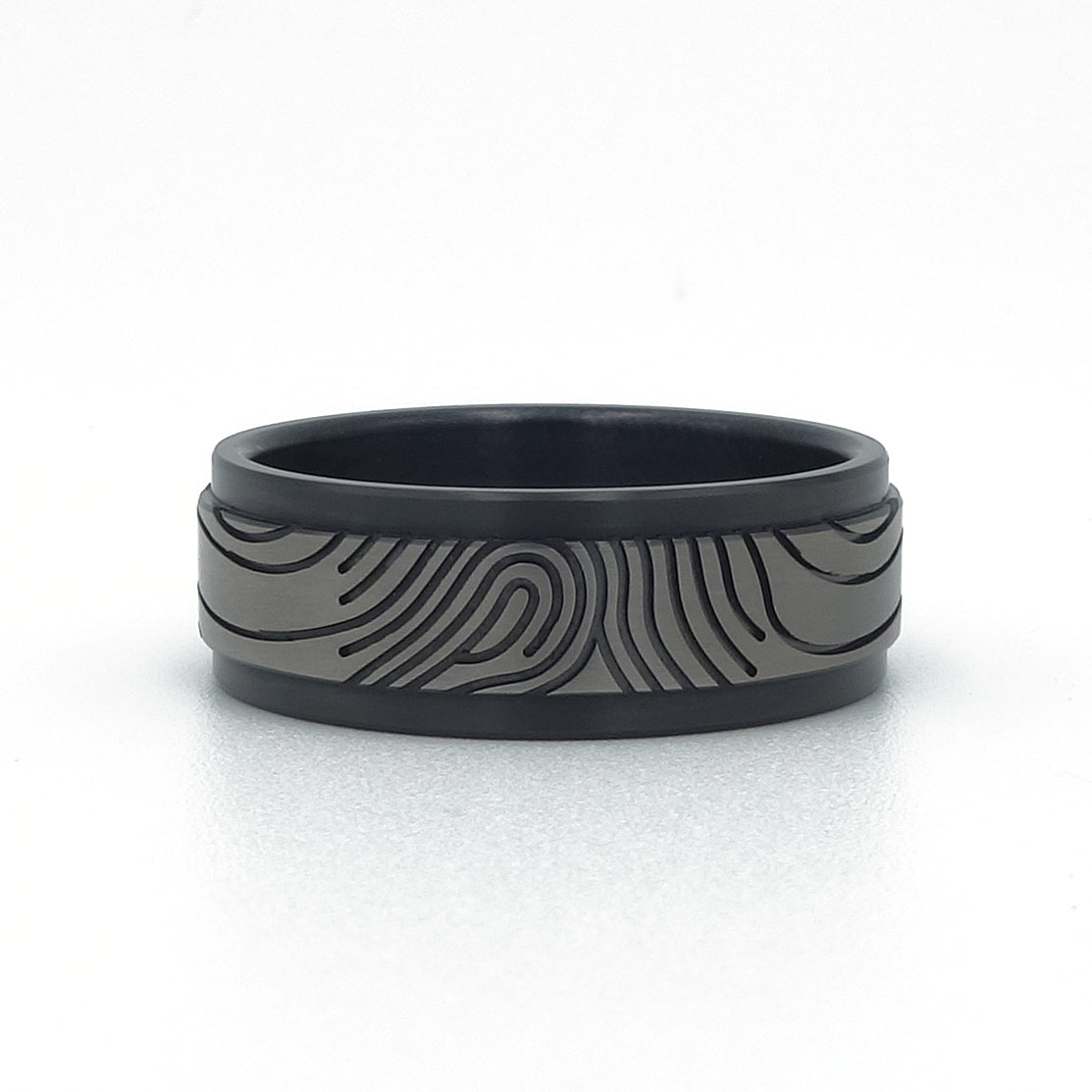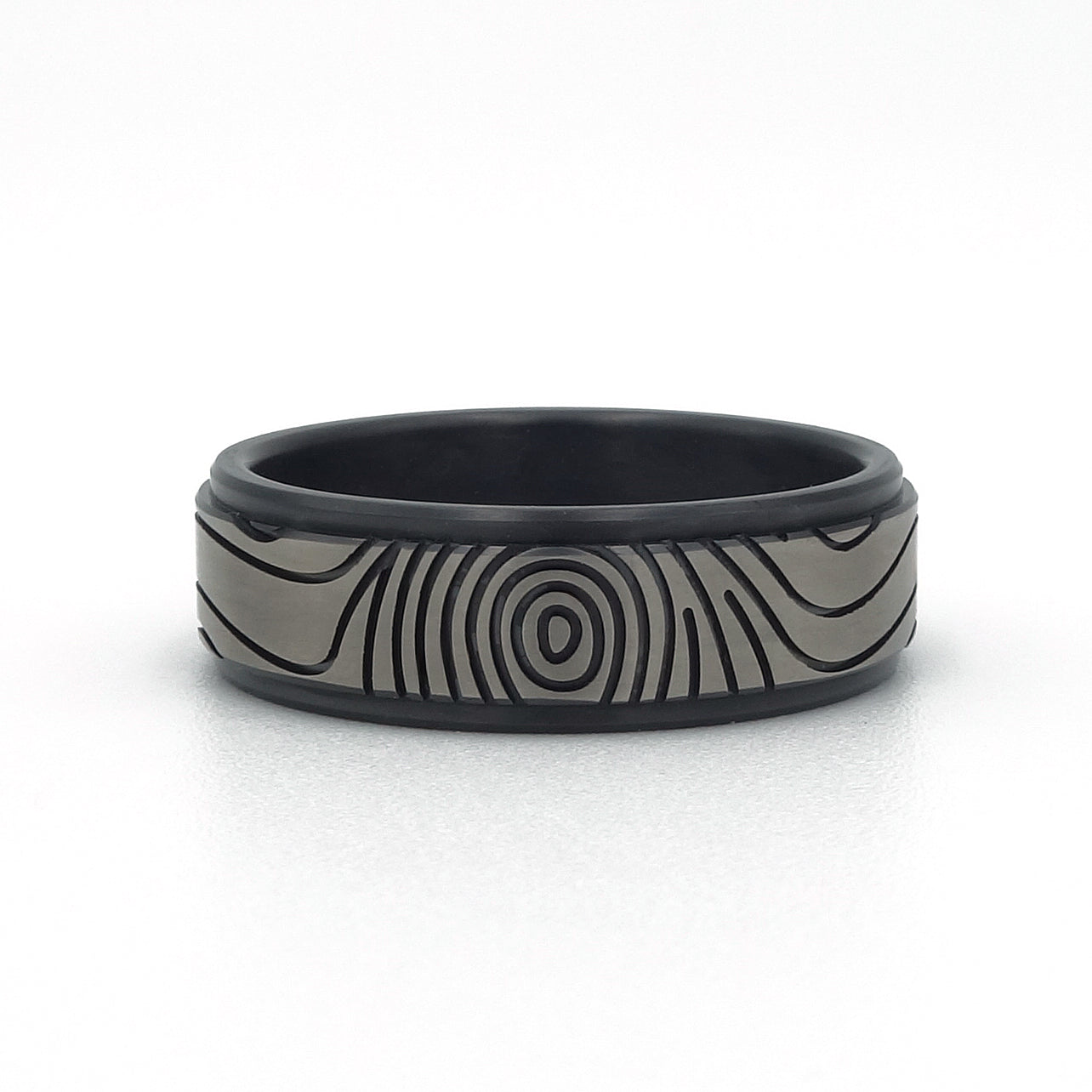 De prijs geldt voor de uitvoering zoals op de foto: ring met rechte binnen- en buitenzijde, zwarte zijkanten en grijs-zwarte vingerafdruklijnen.