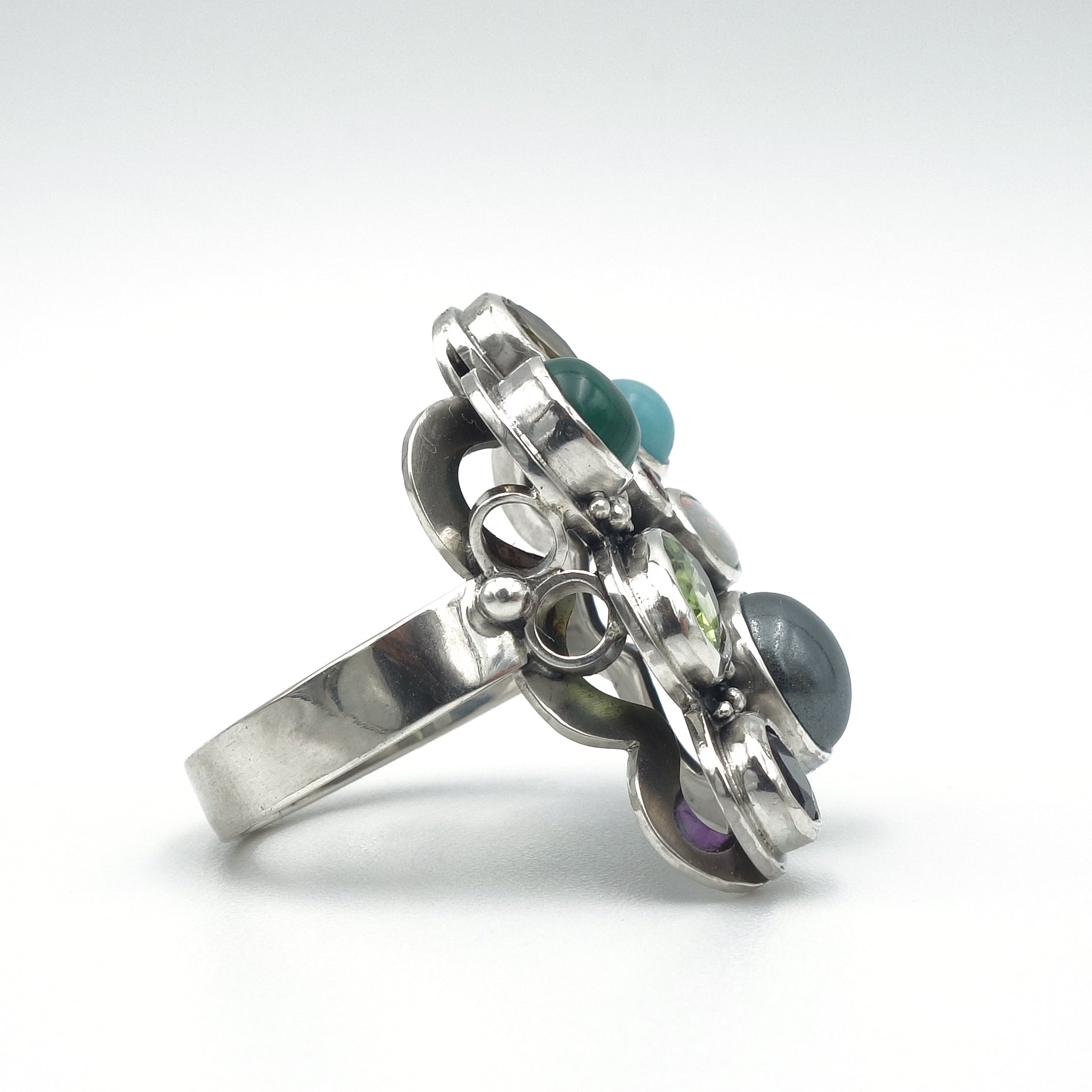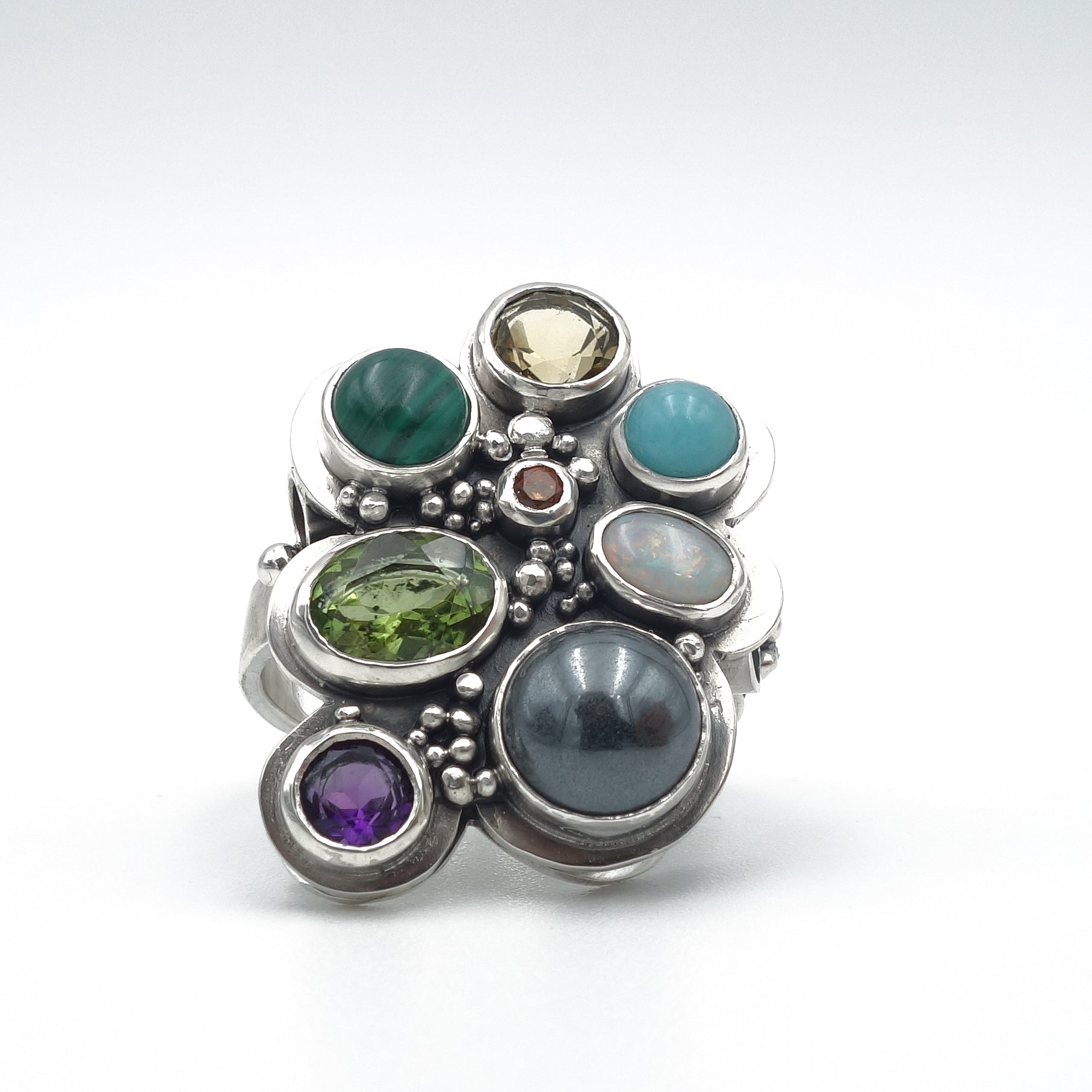Unieke ring met verschillende edelstenen: amethist, peridoot, malachiet, citrien, amazoniet, opaal, hematiet, en (synthetische) padparadja saffier.